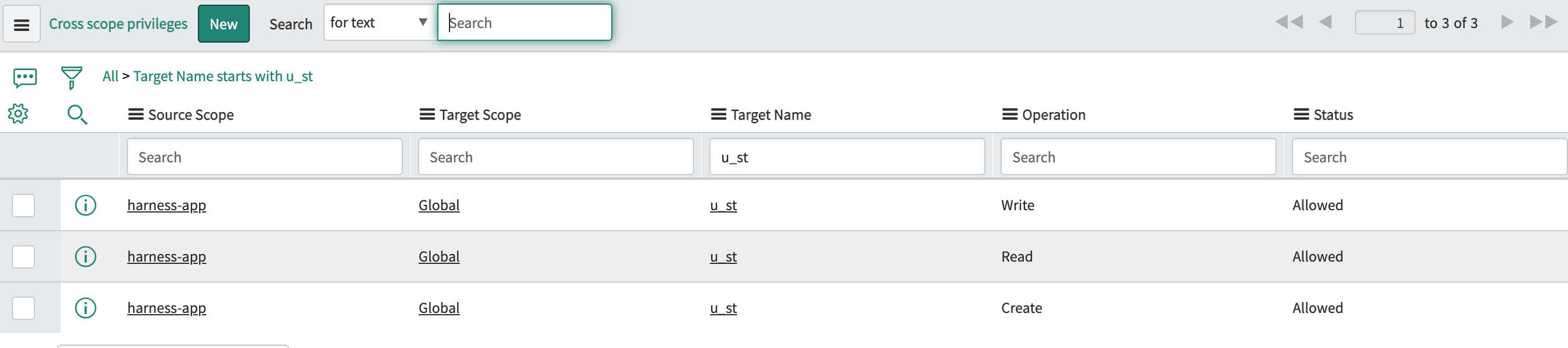 1. Add three (create, read, write) cross-scope privileges from the harness-app to the global scope with the target name as the table name (u_st in this example) and set the Status as Allowed.