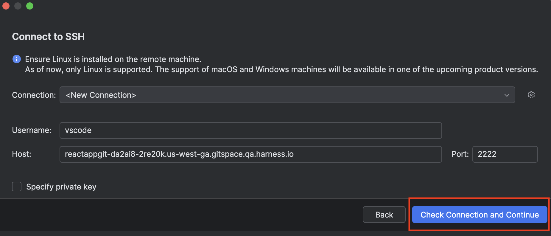 You will be redirected to JetBrains Gateway, where you will be prompted to connect and establish an SSH connection. Click "Check Connection and Continue" to begin the setup process. This setup process will download the necessary files and tools required for your Rider environment.