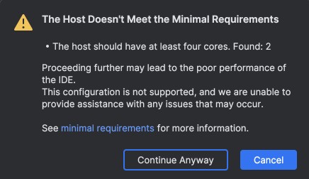 If your Gitspace does not meet the recommended requirements, the following warning may appear during your Rider setup. You can choose to create a new Gitspace that adheres to the recommended specifications or proceed with your existing configuration.