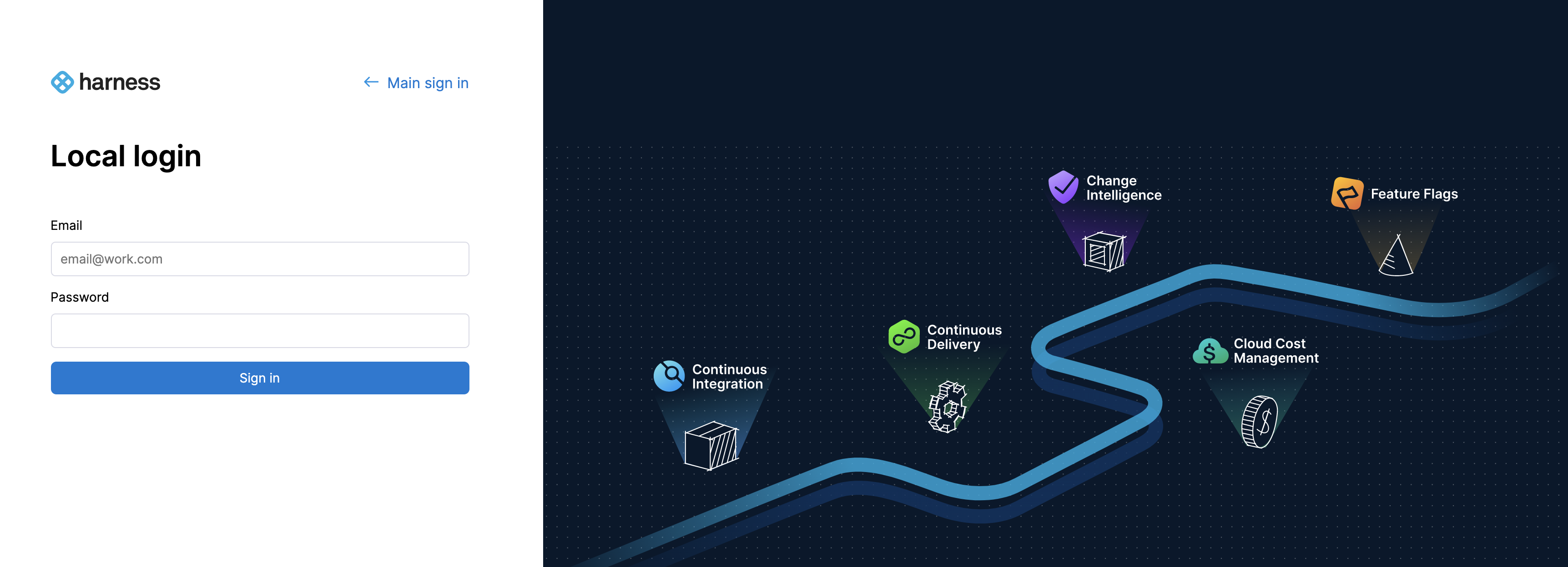 Harness Local Login signs in to the default account for the user. If the user is assigned to multiple accounts, the user must ensure the default account is set correctly before attempting to use Harness Local Login.