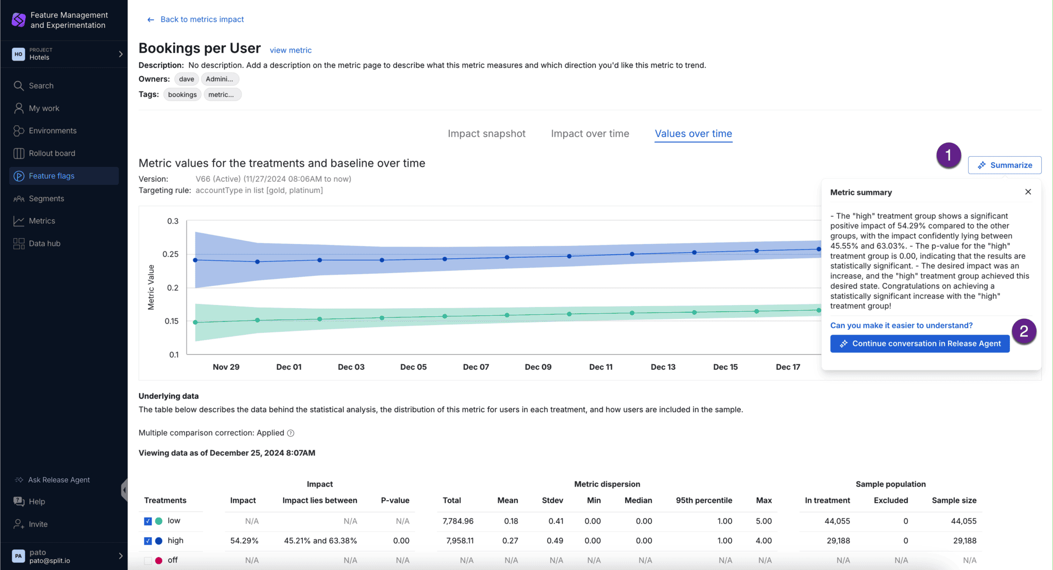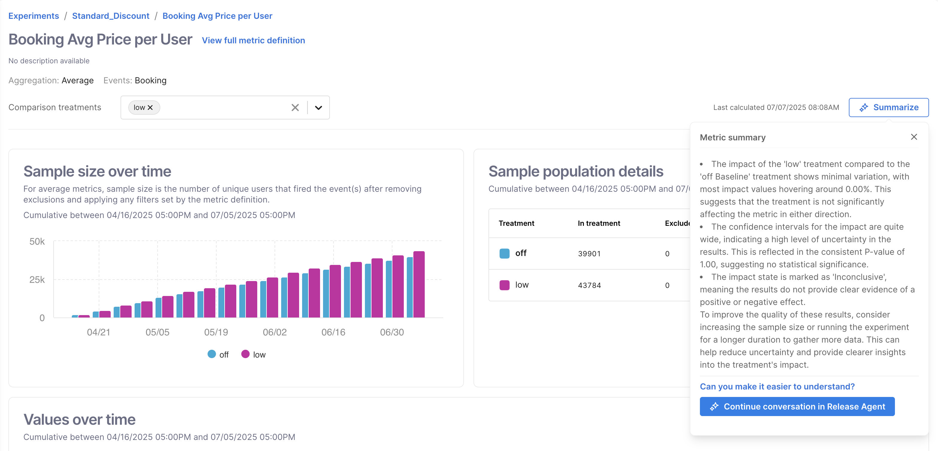The Release Agent can summarize metric results on a feature flag's Metric details page and experiment results on an experiments' Metric details page.