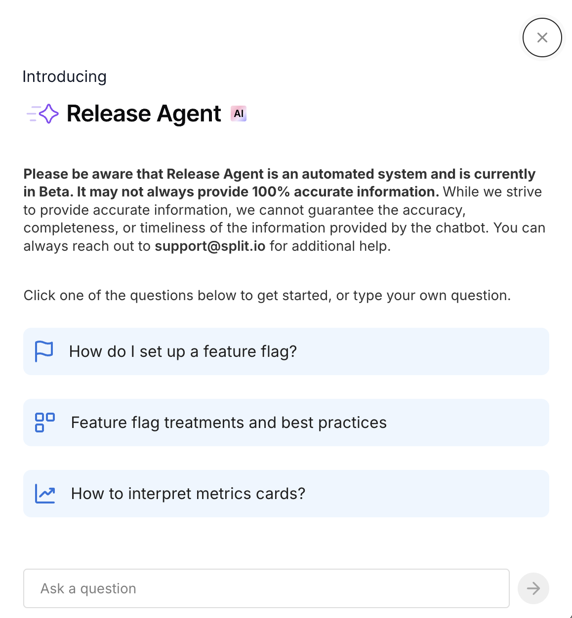 Release Agent is an in-app AI chatbot designed to streamline the use of Harness FME. It offers multilingual support, rapid responses, and knowledge-based assistance by utilizing our public documentation and blogs.