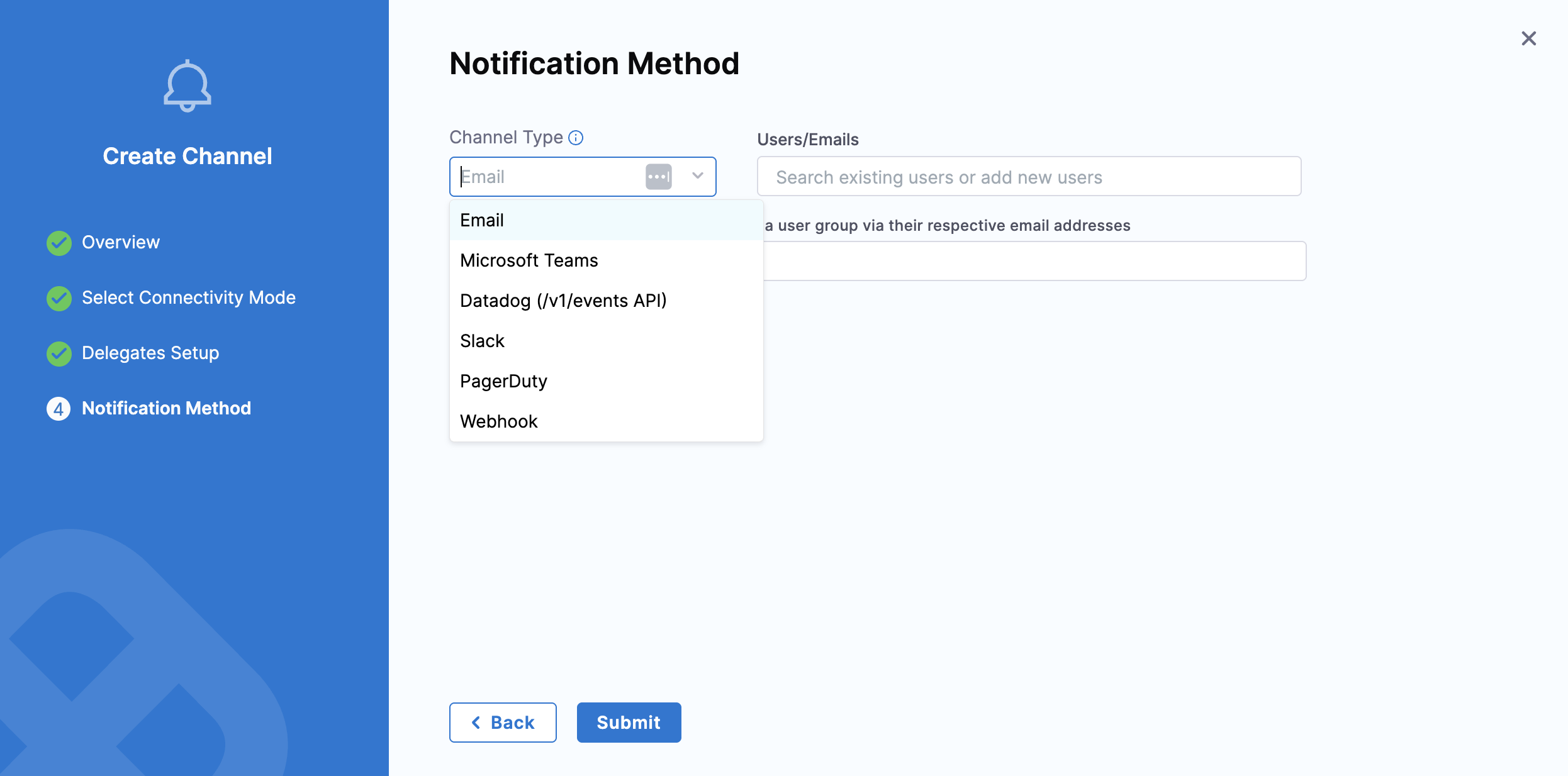 noteIf you select the Connectivity Mode as "Connect through a Harness Delegate" and Channel Type as "Email", ensure to add an SMTP configuration to which the Harness delegate has access. If this is not done, then the Email notifications will fail.
