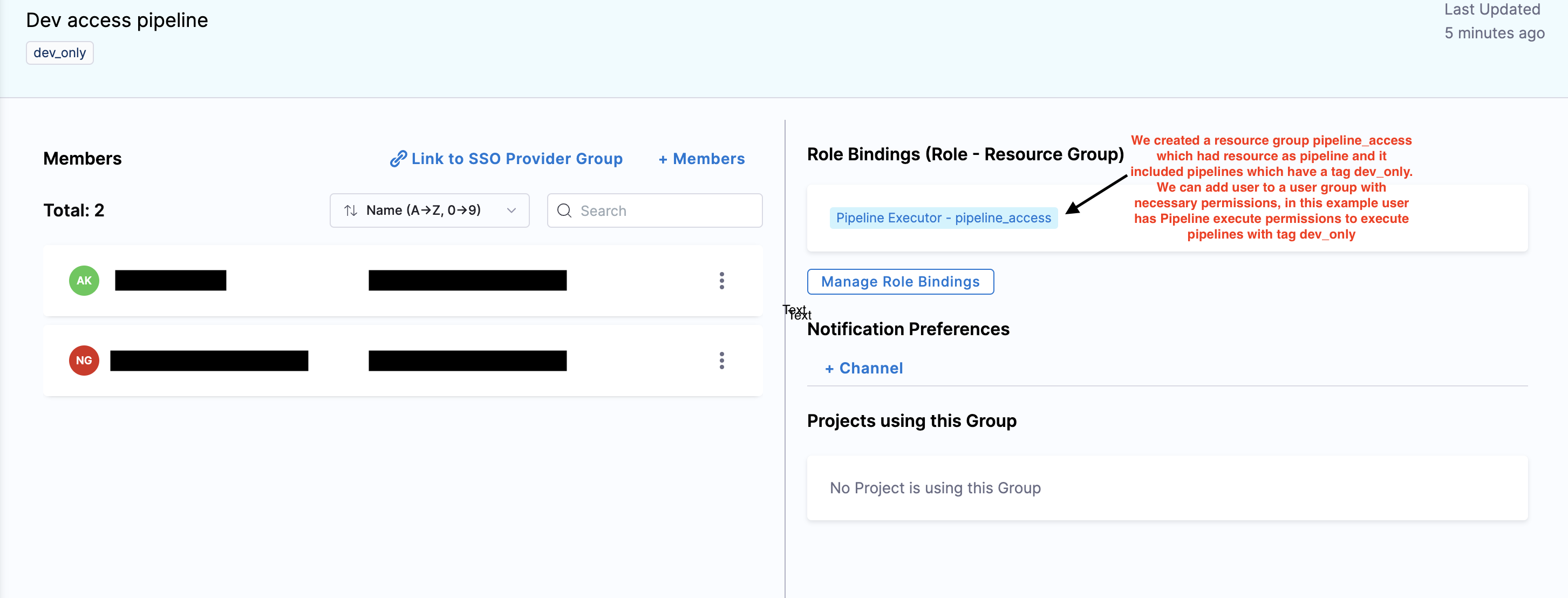 Now, you can give users the required access by adding users to a user group and assigning permissions to the resource groups. For example, you can create a user group for developers that will have Pipeline Executor access to this Resource group. This will ensure that all users in this group have access to pipelines tagged with type: dev_only. Also if you want to remove a certain pipeline from the resource group all you need to do is remove the tag and it will automatically get removed from that particular Resource Group without a need to edit the Resource Group.