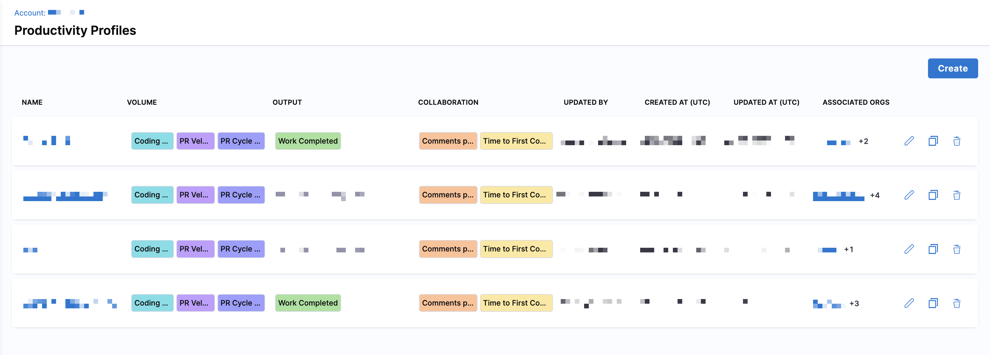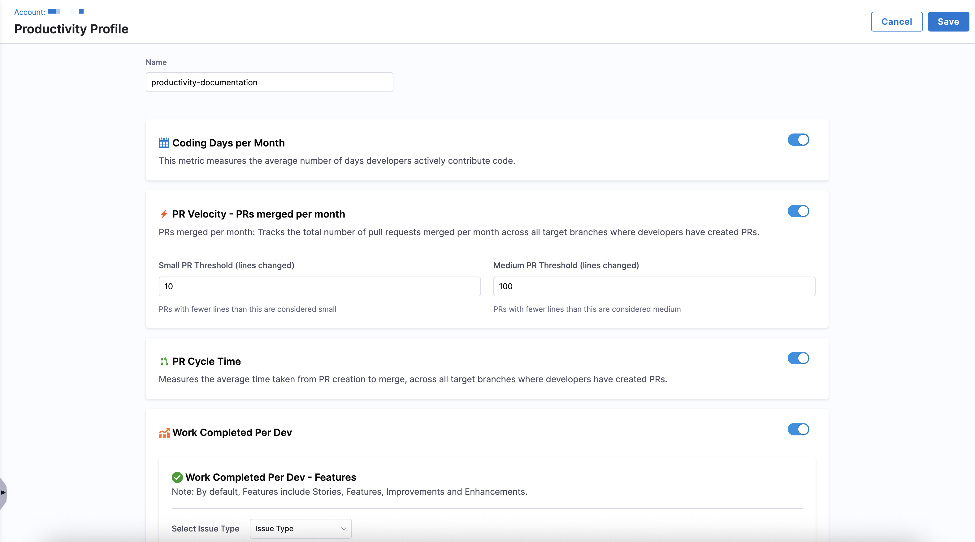 A Productivity Profile helps you define how developer activity and contribution metrics are calculated in SEI 2.0. These profiles surface key insights such as coding frequency, pull request behavior, and work completed per developer without requiring any manual resource definitions.