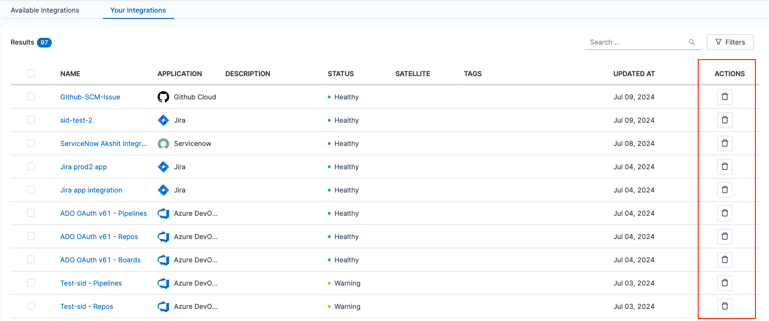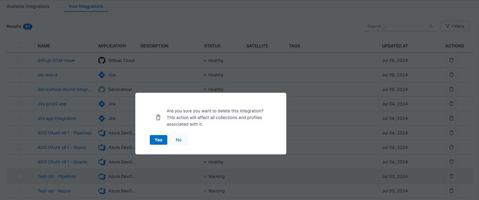 - Click on the delete icon next to the integration you want to remove.
