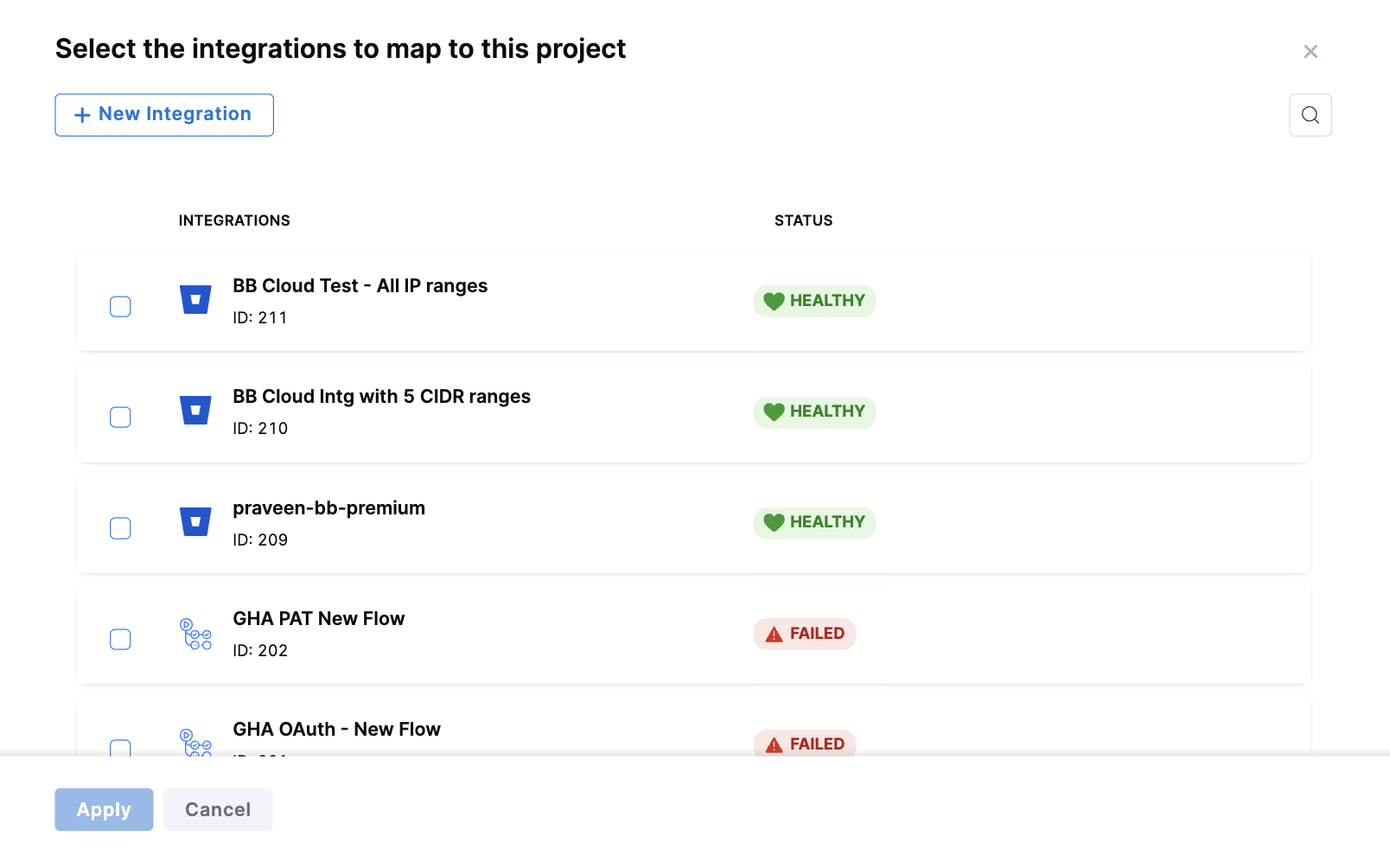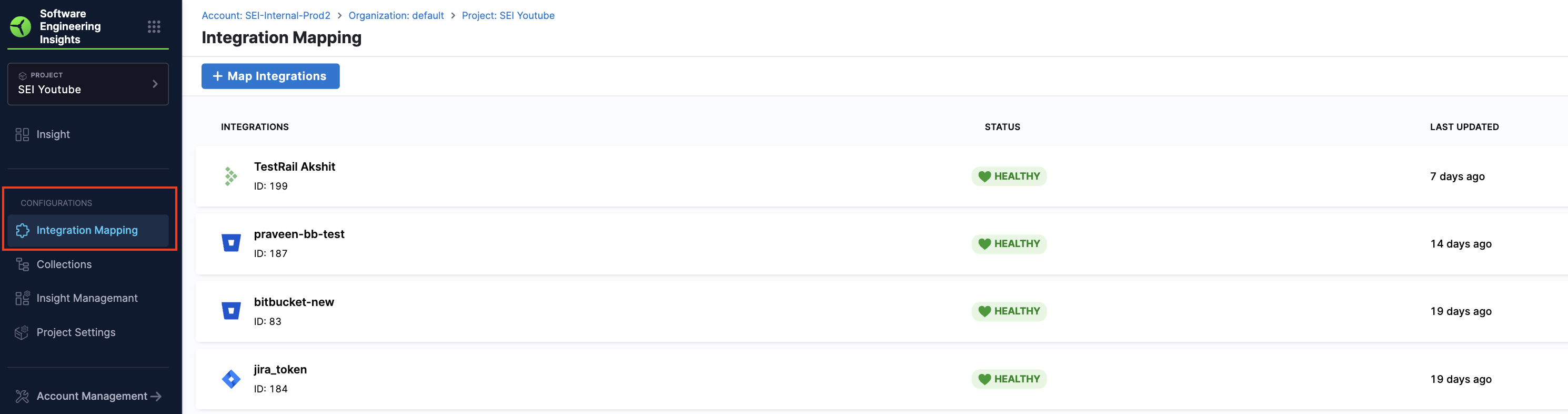 Integration mapping refers to the process of associating existing or new integrations with your current project. After creating the project, you can proceed to set up and map integrations to it. It's important to associate the integrations correctly with the project in order to ensure that the widgets on the Insight display accurate data.