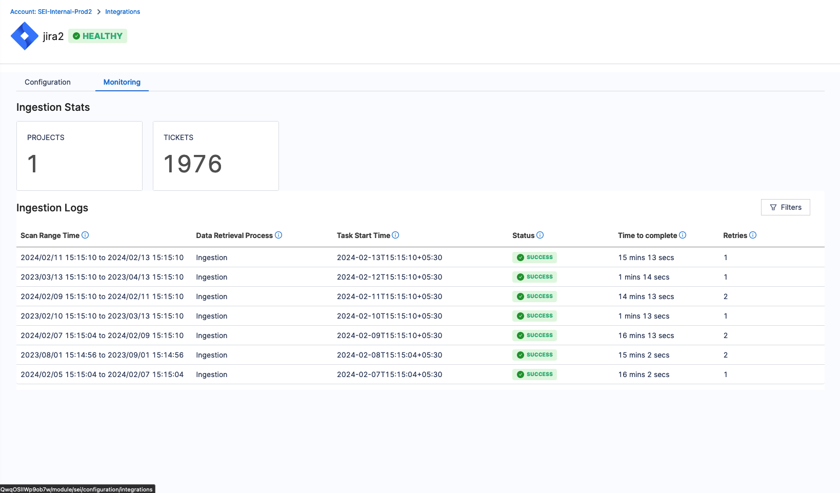 You can review previous ingestion activities in the Ingestion Logs section and view their respective statuses. You can also access additional details such as the Ingestion Task Start Time, Time taken to Complete the Ingestion Task, and Number of Retries for the Ingestion Scan.
