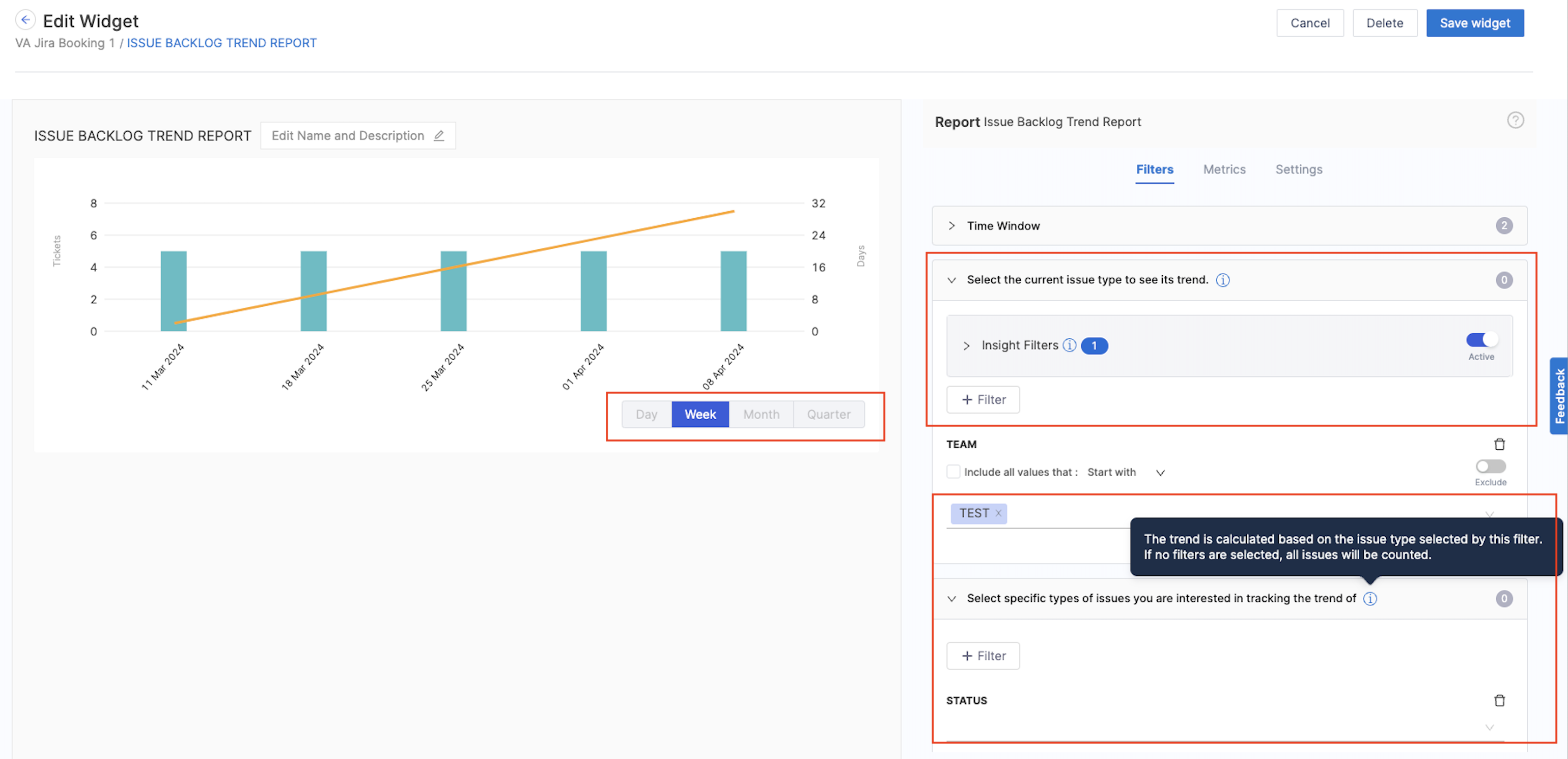 - Fixed a bug in the Jira Backlog Trend Report where the first month's bar was missing from the bar chart when selecting time ranges like Last Month, Last 3 Months, Last Quarter, or Last 2 Quarters. (SEI-10818)
